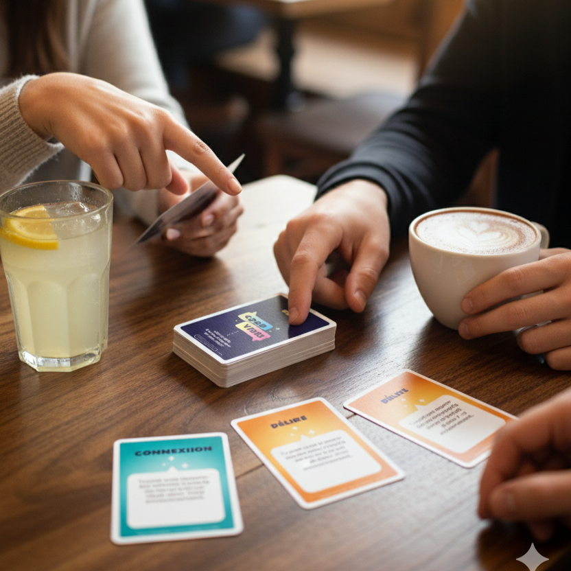 Il suffit de dégainer ton paquet, de mélanger et de tirer une carte à tour de rôle. Les silences se transforment en rires, en complicité… et peut-être en coup de foudre !